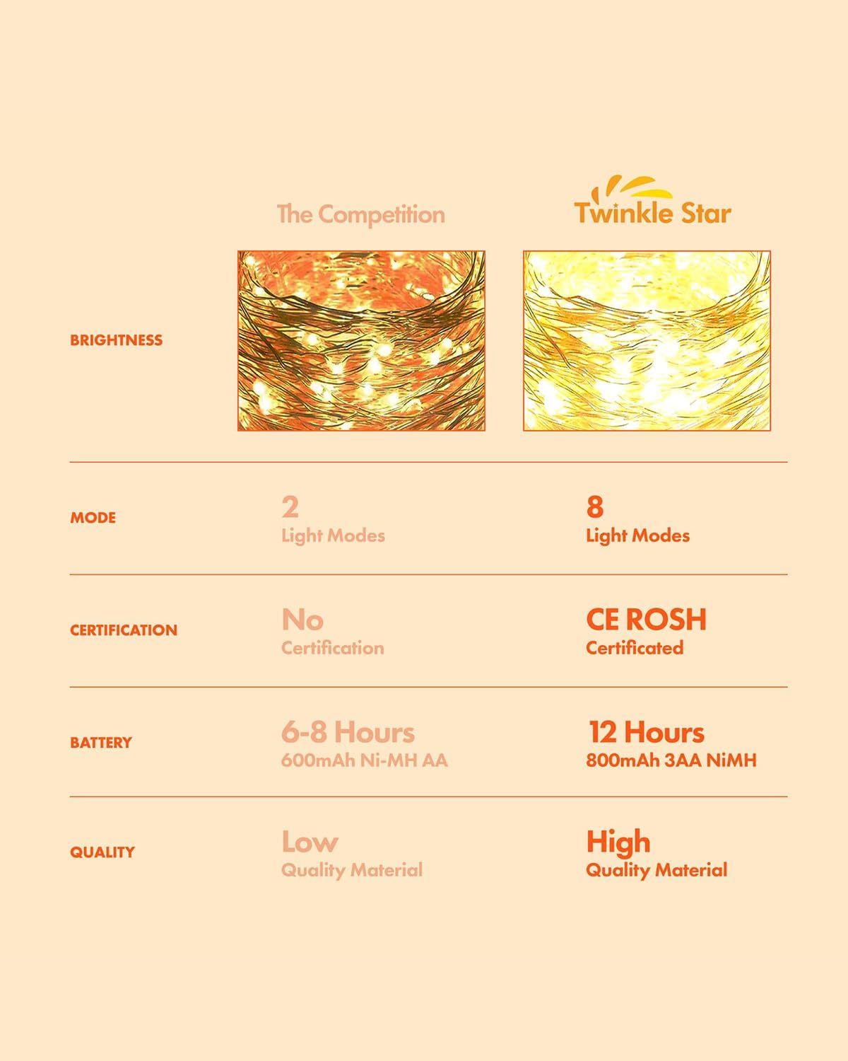 • Solar String Lights Outdoor: Add a soft, festive glow to your Christmas decor with Twinkle Star 2 pack 120 super bright LED solar string lights for outside. Made of thin and flexible wire, easily build the shapes you want, enhancing outdoor lighting in every holiday season. The string lights is 39.4 ft, Long power cord: 6.5 ft, Total Length: 45.9ft.