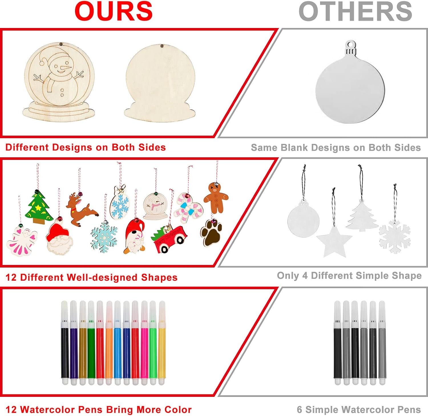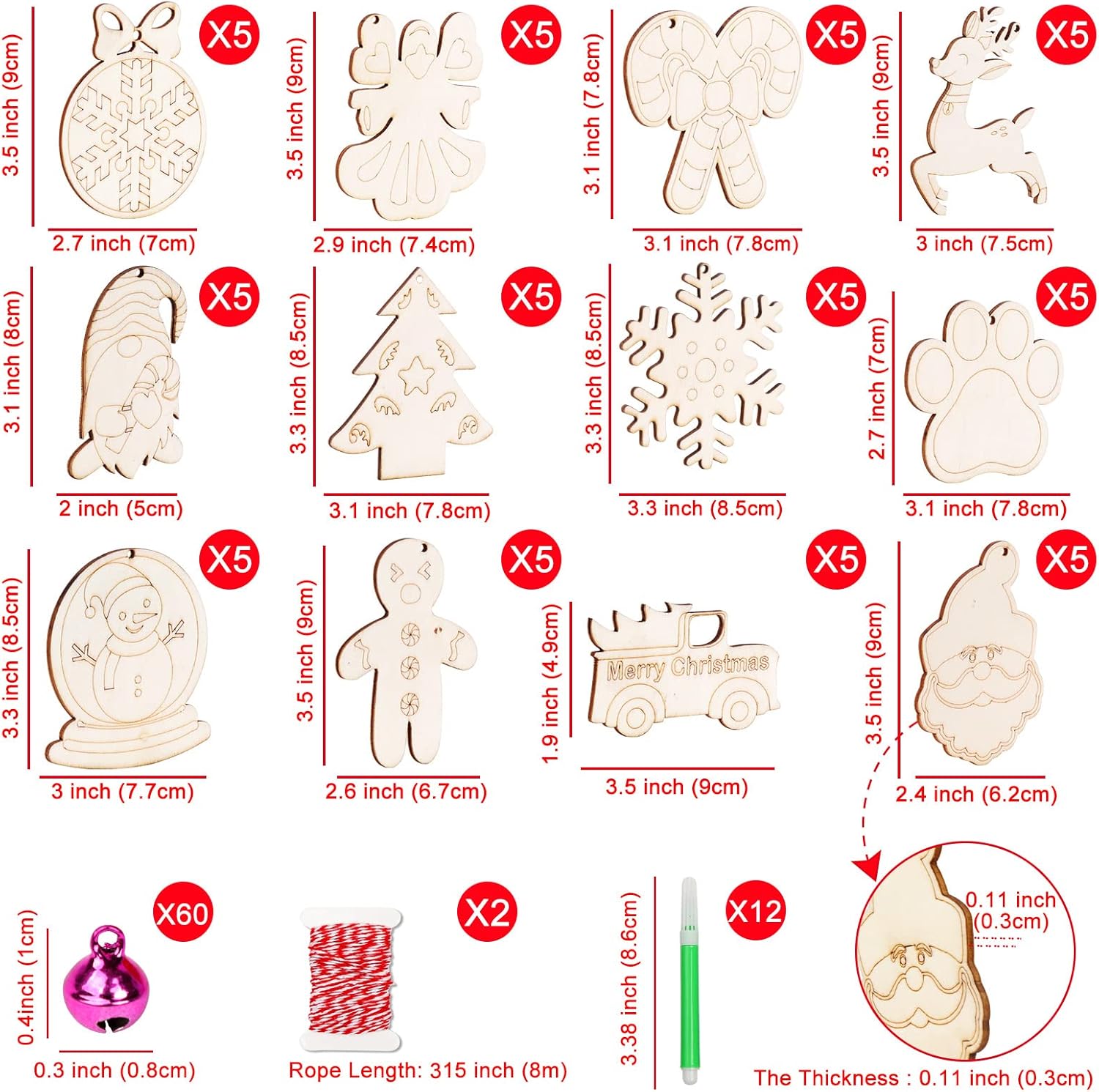 GUDELAK 60PCS DIY Wooden Christmas Ornaments, 12 Styles Christmas Crafts for Kids Adults with Ropes, 60 Bells and 12 Colored Pens, Unfinished Wood Ornaments Making Kit for Christmas Tree Decorations