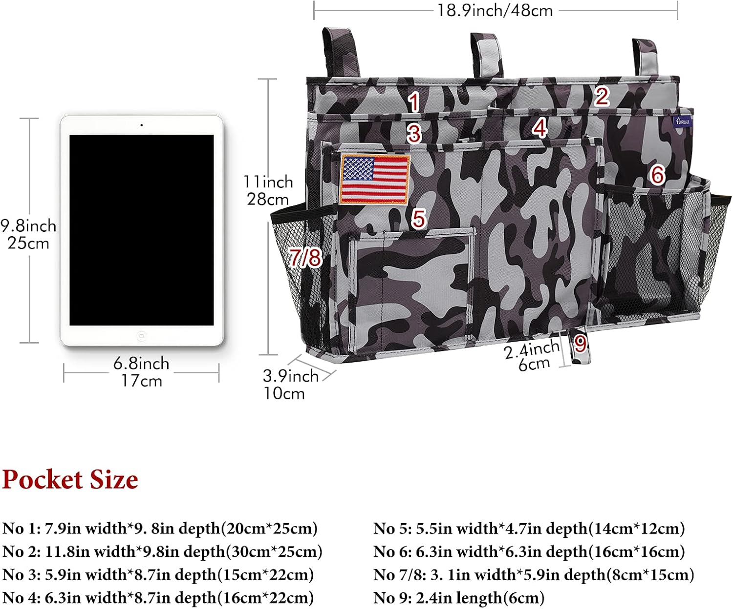 • Size: The large bedside caddy is 19*3.9*11 inches/48*10*28cm. The storage bag has 8 pockets that are bunk bed accessories, meeting the request for multi-storage.