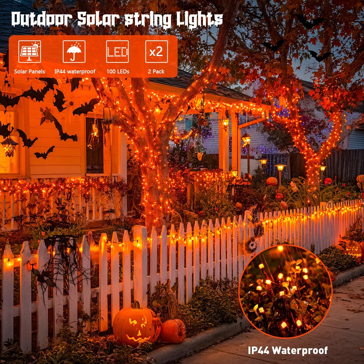 • 100LED Orange Solar Halloween Lights: Total Length: 13 m/42.7 ft, light length: 10m/32.8feet, Lead wire Length: 3m/9.9ft, Space between LEDs: 10 cm/3.94 inch