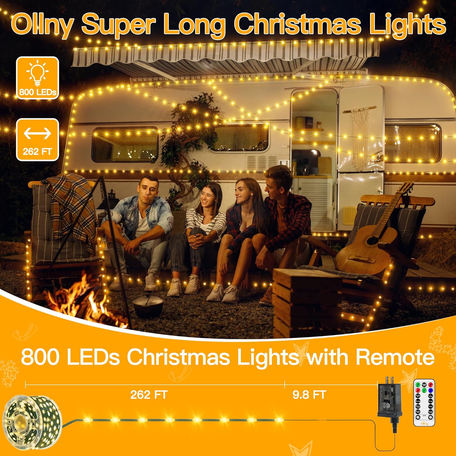 Ollny Christmas Lights 800 LED 262 FT Plug in, IP67 Waterproof Green Wire Outdoor Christmas Lights with Remote, 8 Modes and Timer Outdoor String Light for House Indoor Xmas Decorations (Warm White)