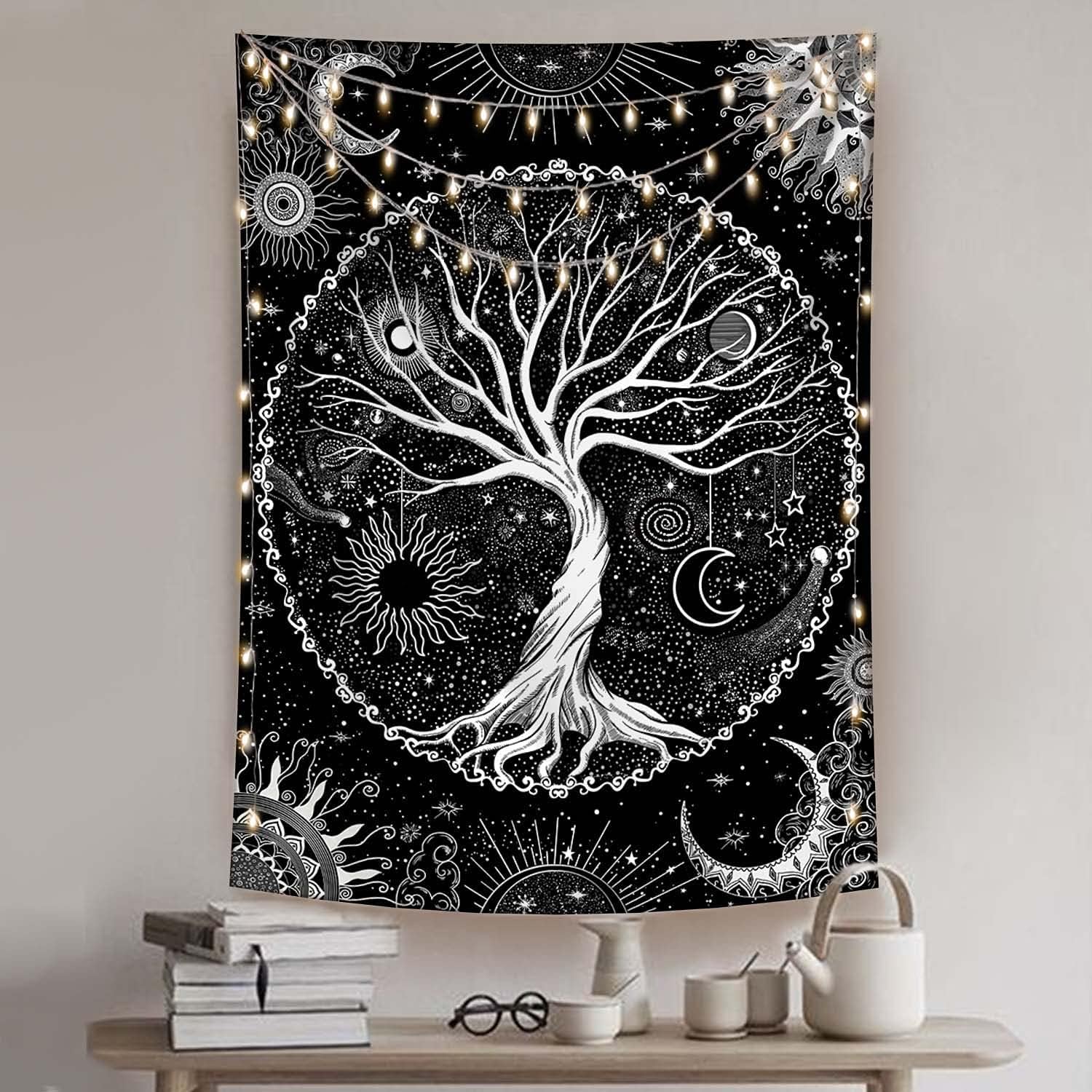 • Intricate Tree of Life Design: This tapestry features a stunning depiction of the Tree of Life surrounded by celestial elements like the sun, moon, and stars. The black and white design adds a mystical and elegant touch, making it perfect for any space that needs a spiritual and artistic atmosphere.