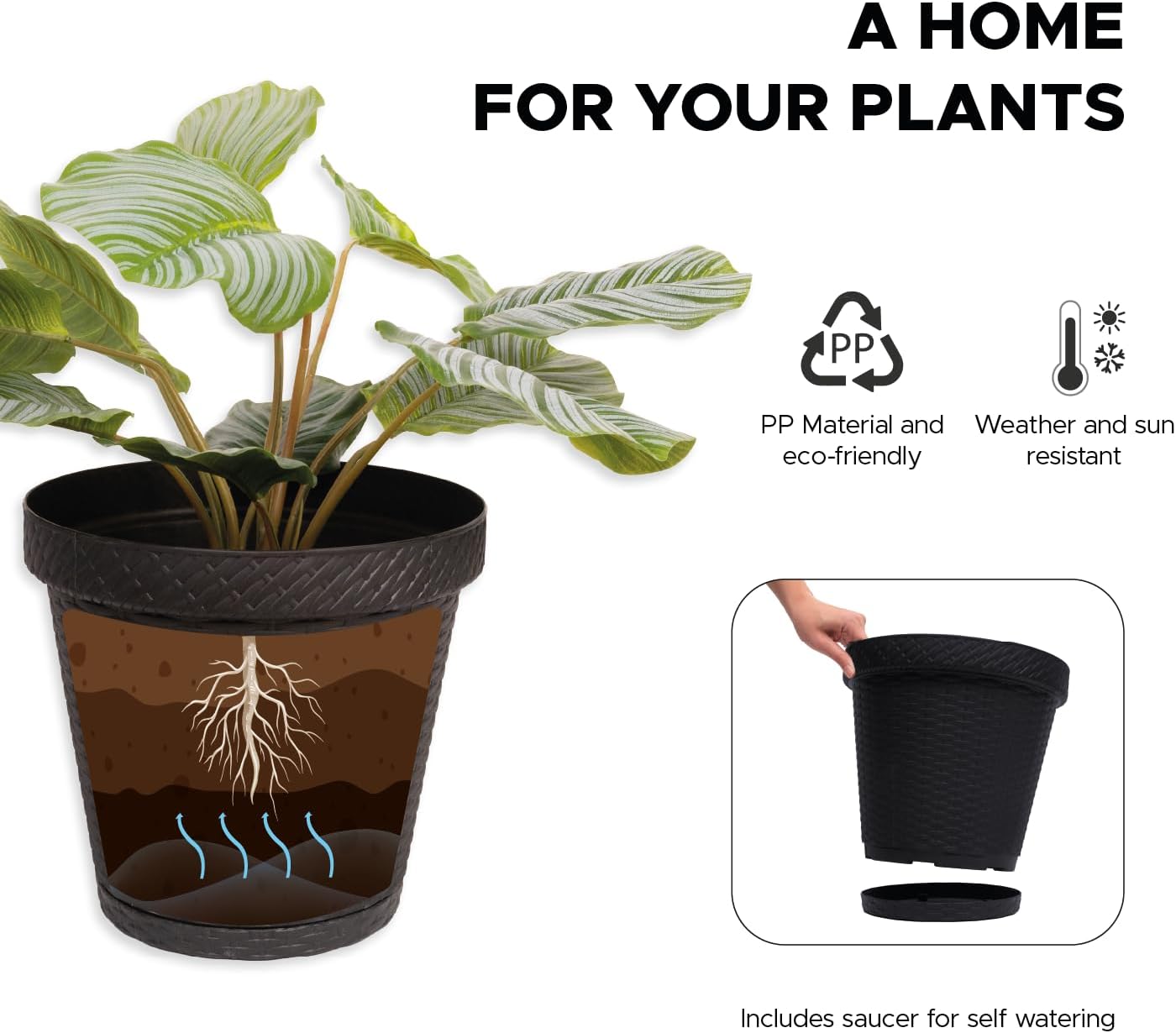 • 🪴SELFWATERING SAUCERS🪴 Each planter has An attachable saucer , than prevents the water go out from the planter and helps to use the most of the water for the plant. The soil are easy keep just the right wet