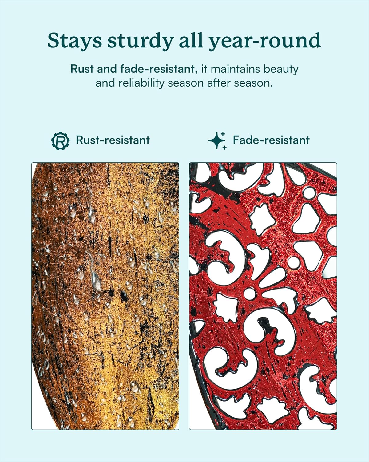 • SOLAR OUTDOOR METAL DECOR: Made of sturdy metal with protective coating finishes. UV, RUST, and FADE RESISTANT. The all-season decorative spinner can be cleaned easily to keep its reflective shine and rustic appearance. Long-lasting use.