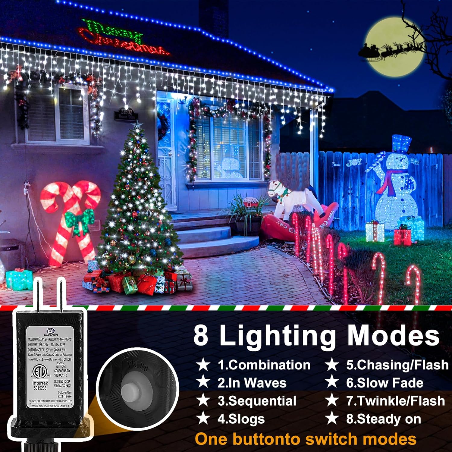 • 8 Lighting Modes Christmas Lights: Christmas lights outdoor modes include Combination, In Waves, Sequential, Slo Glo, Flash, Slow Fade, Twinkle, and Steady On, all controlled by one button. Make your home stand out on the block with our Christmas string lights
