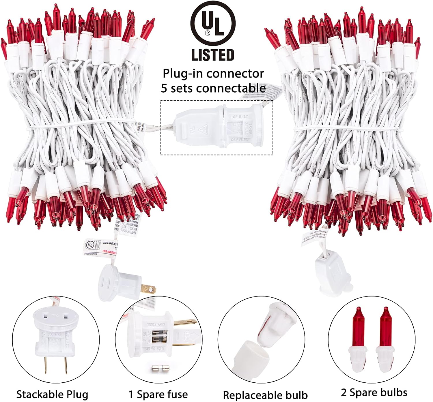 • Creative Mini Red Christmas Lights Set: This Christmas light on white wire set includes 100 transparent mini-lights, total length 26.5 feet white wires, and each bulb is 2.5 inches apart. It can be connected end-to-end to meet your decoration needs, up to 5 creative light strings