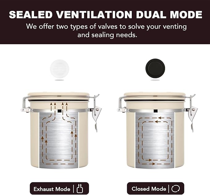 • 【TWO EXHAUST MODES】The canister features a CO₂ valve system and a silicone seal to lock in freshness and keep out moisture and air. A silicone gasket around the edge of the lid ensures an airtight seal when the lid is closed. Storing your coffee beans in this well-designed canister helps extend their freshness and ensures that every cup, even weeks later, tastes as good as the first.