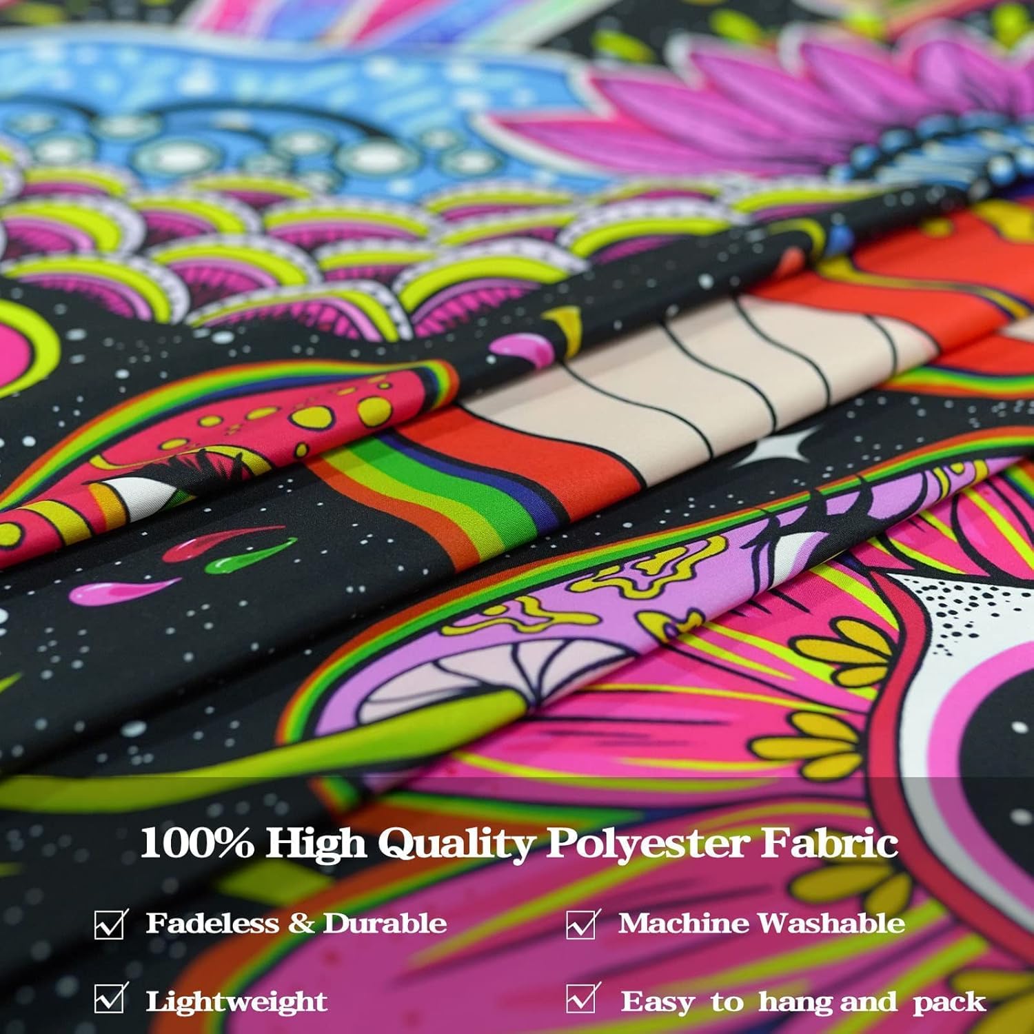 • Vibrant Pink Mushroom Design: This tapestry showcases a bold and colorful psychedelic scene with pink mushrooms and vibrant floral elements, creating a lively, artistic statement. Perfect for adding a splash of color and creativity to your bedroom, living room, or any space in need of energy.