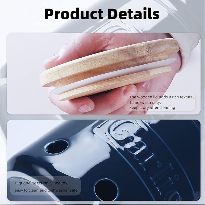 Large Garlic Keeper with Wooden Lid, Ceramic Garlic Holder Storage, Garlic Container for Kitchen, Garlic Saver to Keep Your Garlic Cloves Fresh Longer 4.5-Inch, Navy