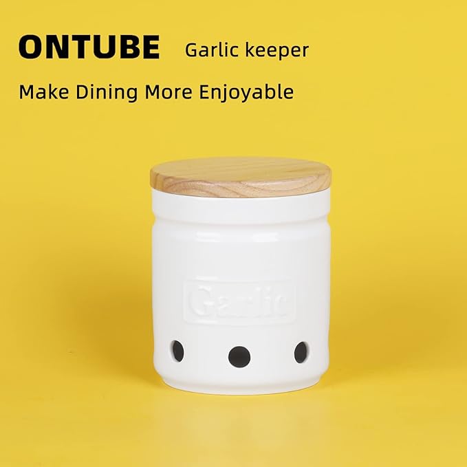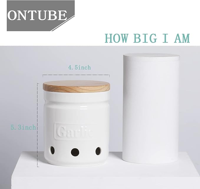 • HUMANIZED DESIGN : ONTUBE Garlic Keeper's size is 4.5"Lx4.5"Wx5.4"H which can easily hold 3 to 4 heads of normal size garlic. Because it is deep enough, it can even hold 2 potatoes