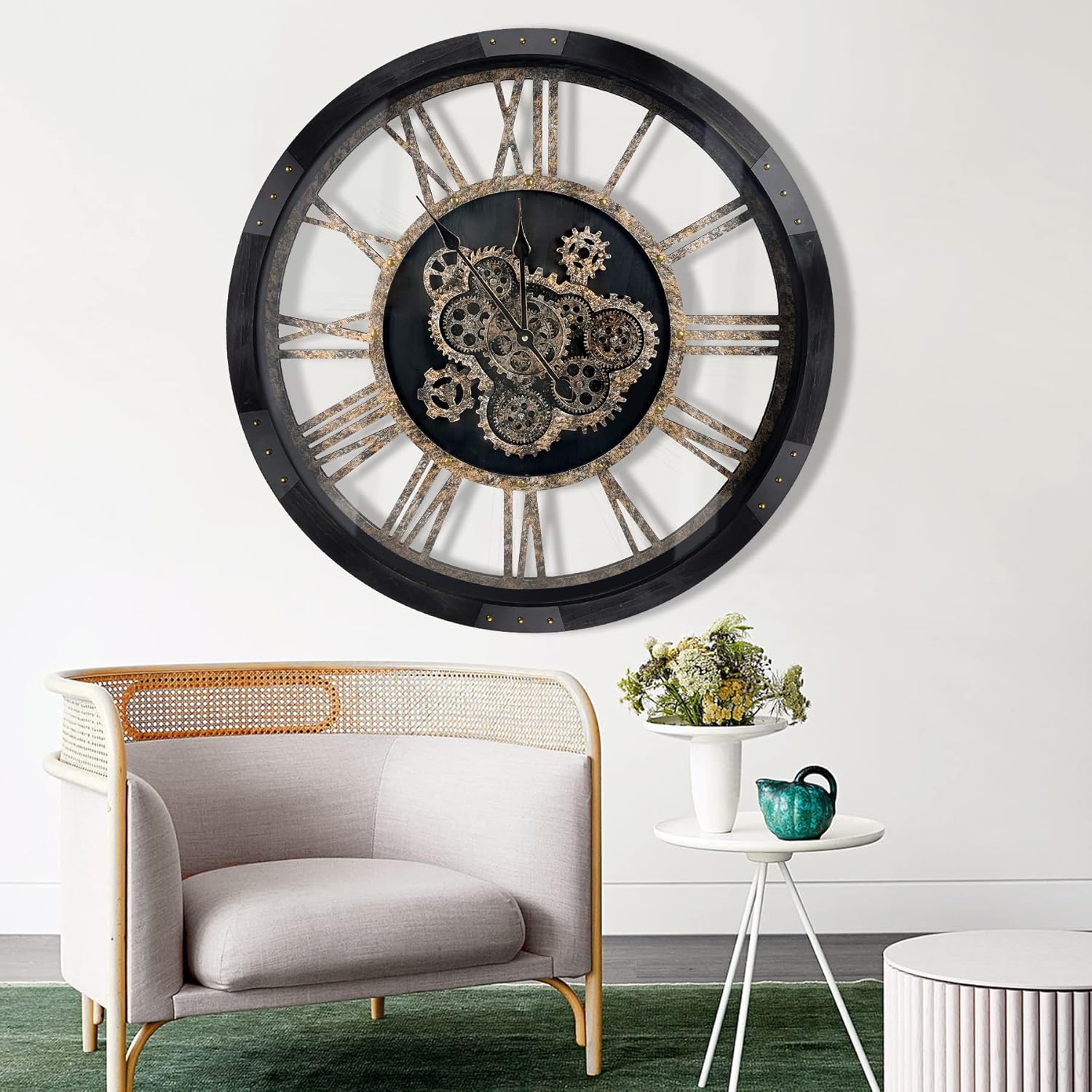 • Real Moving Gears Wall Clock: The big rustic wall clock is designed with multi-real moving gears, put battery in, various gears start working, makes a soft relaxing sound and makes a living element in the environment in where it is placed, vintage and magical, catch all eyes of visitors