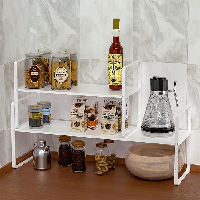iPEGTOP Expandable Cabinet Storage Shelf Organizer Rack, Heavy Duty Steel Metal Spice Rack Adjustable Height Pantry Garage Shelf Space Riser for Counter Kitchen Organization, White, 1 Pack