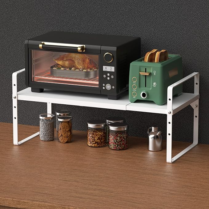• 【Expandable and stackable design】--The Adjustable Countertop Organizer (collapsed) measures 16.7" L x 8" W x 9.8" H, expands from 16.7" to 27.2" length. You can also stack two shelves together to create a two-tier storage space.