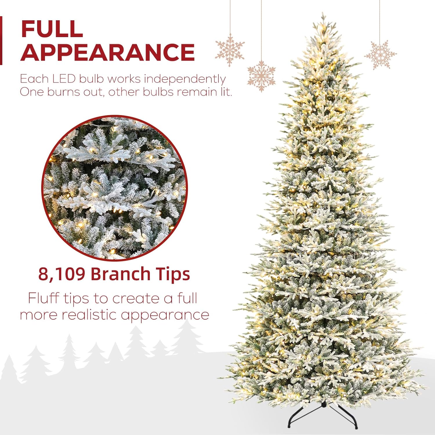 Hykolity 12 ft Prelit Snow Flocked Artificial Christmas Tree, 8109 PE&PVC Branch Tips, 850 Warm White LED Lights, Easy Assembly with Metal Stand and Hinged Branches