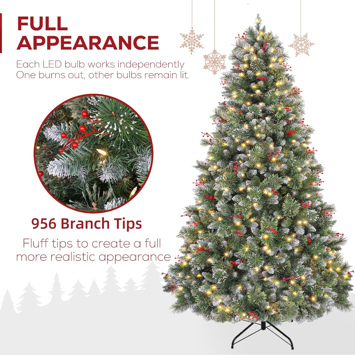• Natural & Lush Look:​​ Experience a luxuriously full 6ft Christmas tree adorned with 956 PVC branch tips and realistic red berries. Snow-dusted pine needles create an enchanting wintry charm, while hassle-free assembly and ample decoration space ensure effortless elegance.