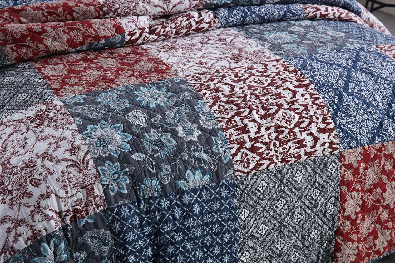 • REVERSIBLE REAL PATCHWORK DESIGN: The reversible quilt set is real stitched with many different patterns pieces sewn together. Its A side is bohemian paisley style and its B side is classic blue floral. The unique design of the quilt set fits for any decoration and will make your room look more luxurious and charming.