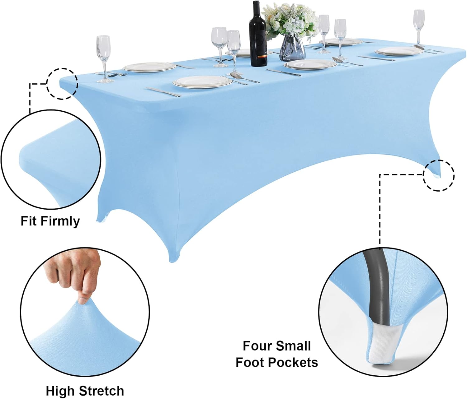 • Size & Design:This stretch table cloth is suitable for standard 4FT tables (48" Length x 30" Width x 30" Height). The four-way stretch spandex material and the elastic pocket design of 4 legs can better fit the table.