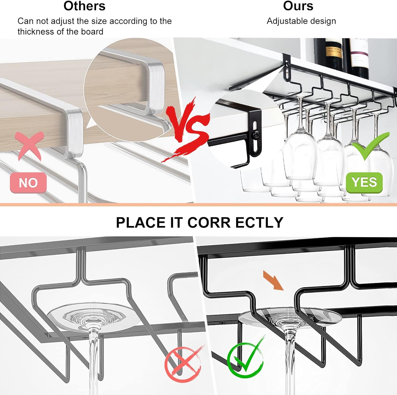 • 【Adiustable Wine Glass Rack】You can adjust the rack's mezzanine width to fit your cupboard, fit for 0.2-1.6in thickness(0.5-4CM). The perforation-free installation design makes the wine glass holder not only suitable for wooden partitions, but also for floating plates of different materials such as stone plates and glass partitions.