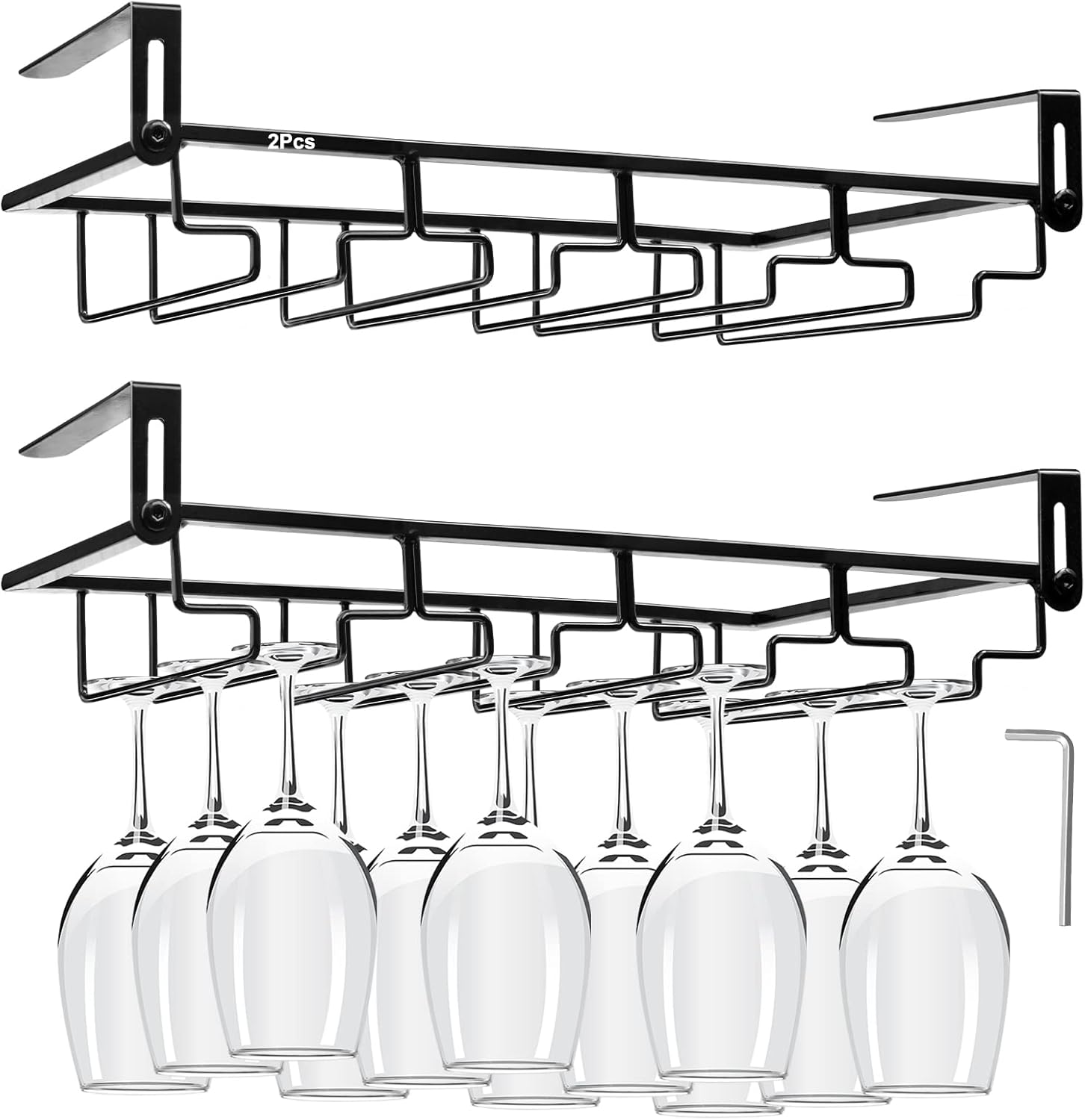 AUHOKY 2Pcs Adjustable Under Cabinet Stemware Metal Glass Holder, Hanging Wine Glass Storage Hanger Organizer for Shelf Kitchen Bar Decor(4 Rows, Black)