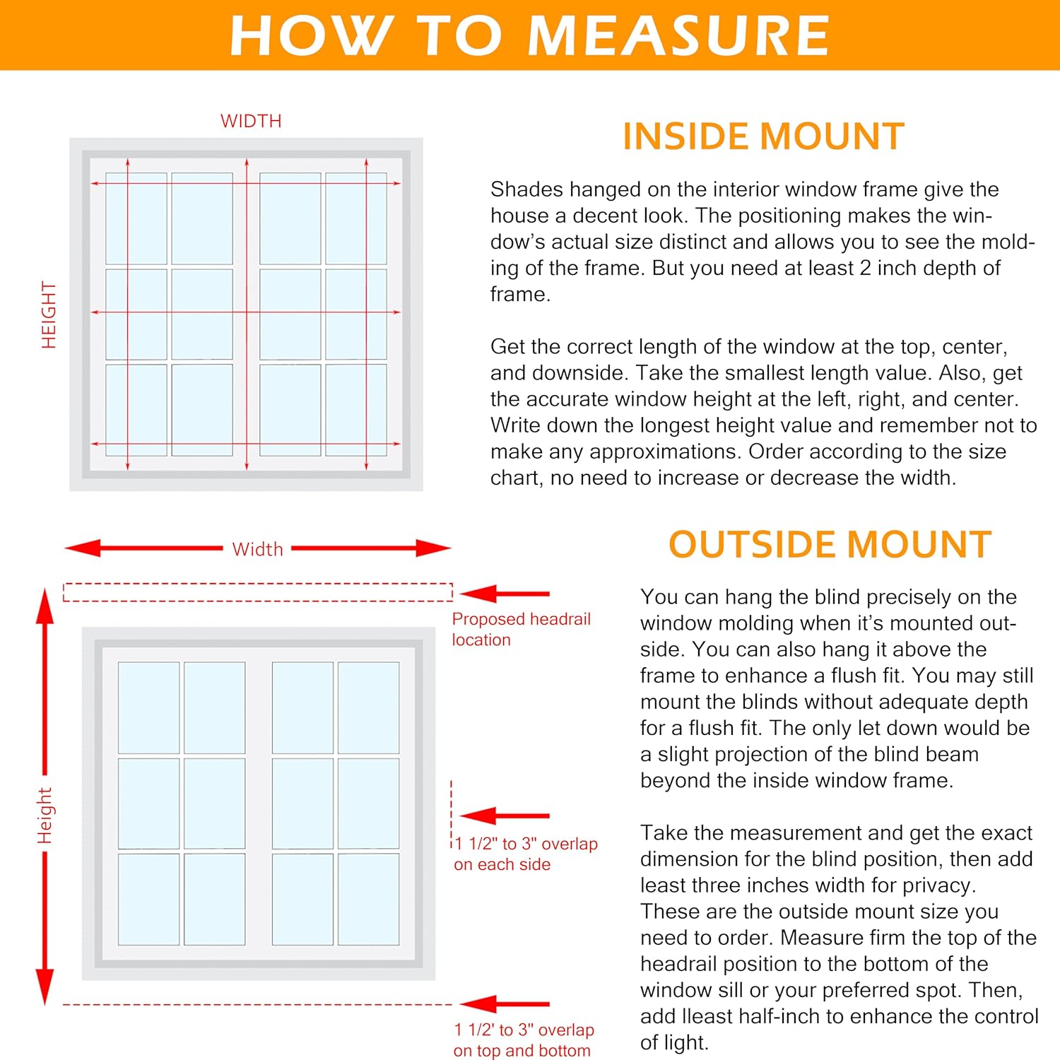 • Window Shades are approximately ½ inch less than the stated width. INSIDE MOUNT: Refer to the table to choose the right width. OUTSIDE MOUNT: Take the measurement and get the exact dimension for the blind position, then add least 3 inches width for privacy. This shade can be mounted inside or outside the window.