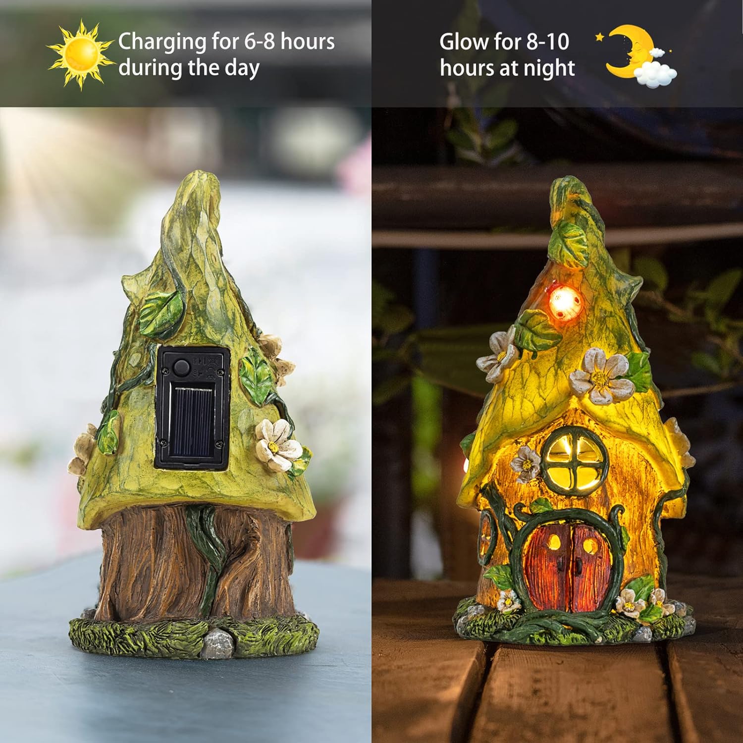 • SOLAR-POWERED: This fairy statues emits a warm glow as the sun sets or the surroundings become dark by absorbing sunlight during the day with the quality built-in solar panel.The solar garden lights just need to pick a nice sunny spot it will faithfully light up and glow every night. It was an amazing decorations to your patio.