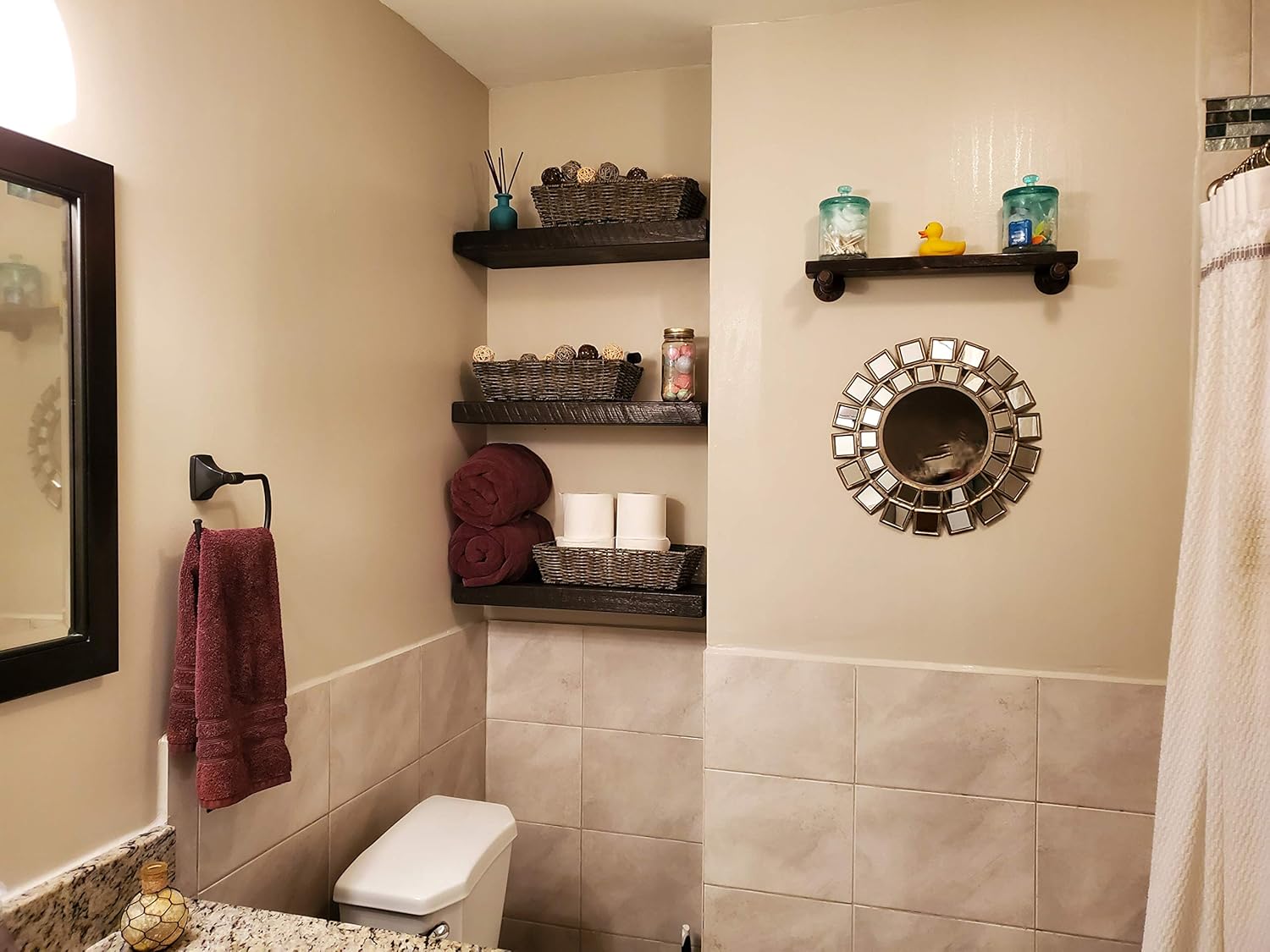 • Elevate Your Space with Rustic Charm: Transform your living room or any space with our large floating shelves for wall. These 18 inch floating shelf beauties, crafted from natural wood, add a touch of rustic warmth and provide ample display space for your cherished items. These are a great depth for photos, and organizing small areas. NOTE: You need to be able to hit one wood stud toward the center of where you want to hang the shelf.