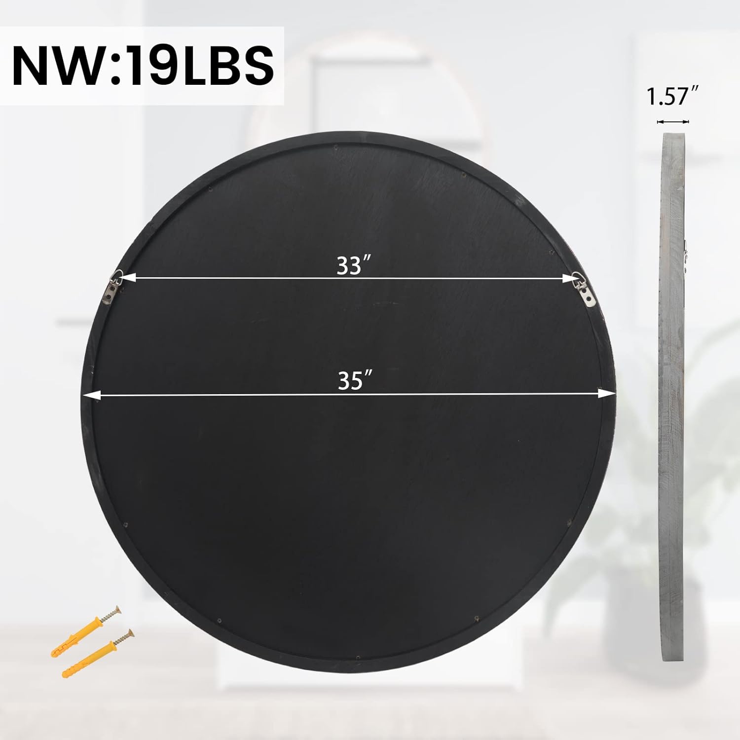 • DECORATIVE WOOD MIRROR: Want to create a unique finish and create a classic atmosphere for your home? You need this 35" wood round mirror on your walls, the 1.57" thick washed frame is more layered, and a great combination of bark textured wood frame and beveled mirror is an understated complement to any decor.