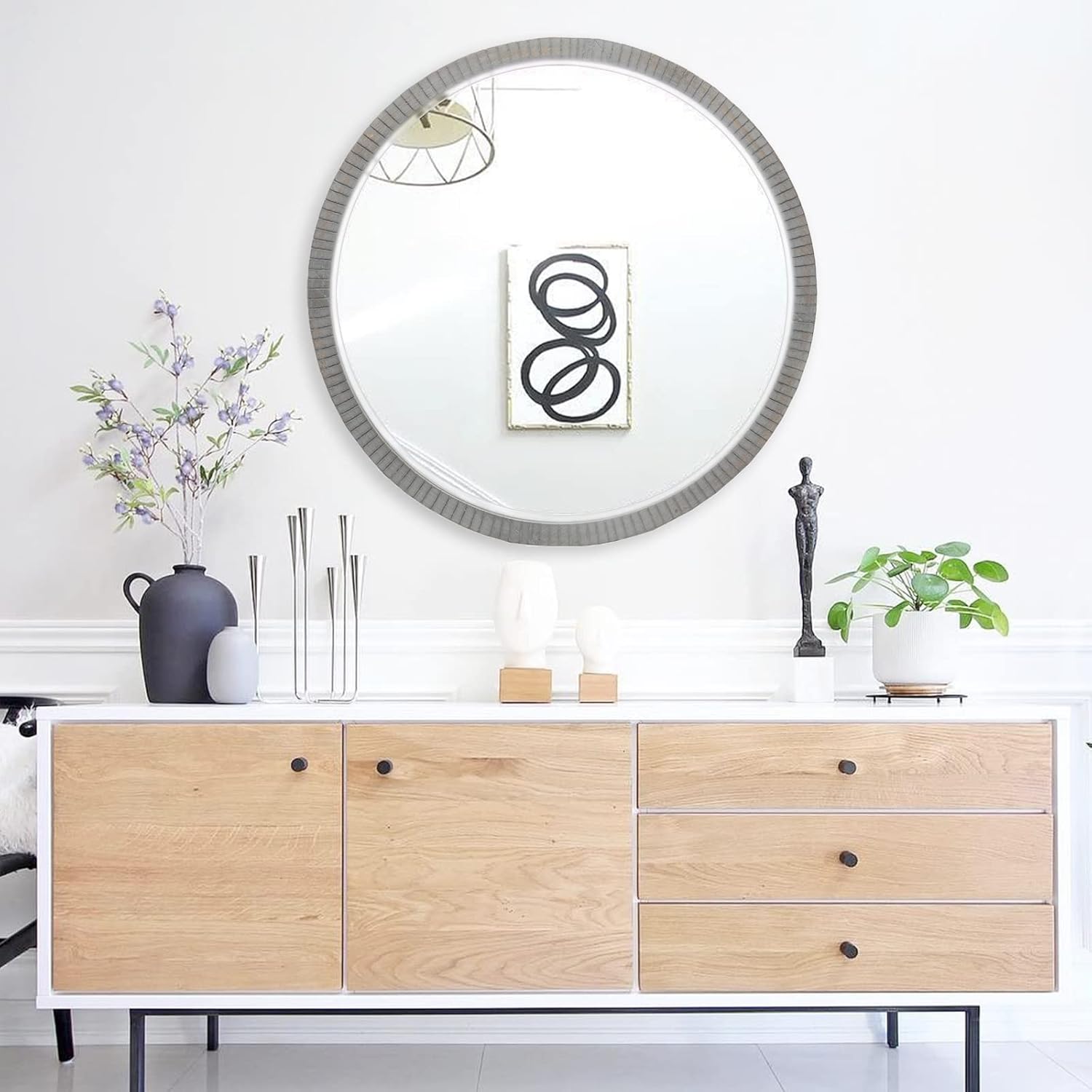 35" Round Wood Mirror, Rustic Circle Wall Mirror with Beveled, Wooden Round Mirror for Wall Decor, Decorative Wall-Mounted Mirror for Entryway, Living Room, Washed Gray Frame