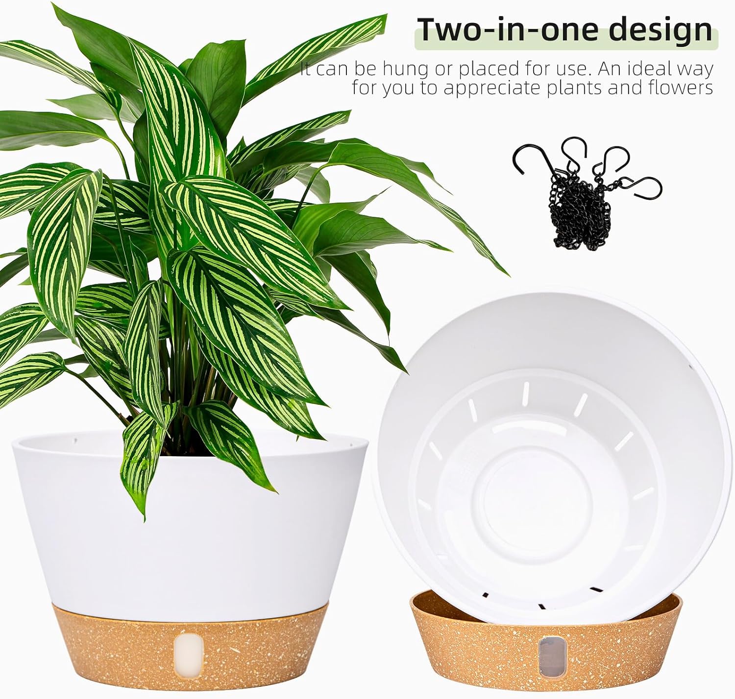 • SELF WATERING & VISIBLE WATER LEVEL: Self watering hanging pot is ingeniously designed, tightly connecting the tray and the pot body, turning the tray into a water reservoir with visible holes, allowing you to clearly see the water level (If you water too much, water will flow out from the edge of the tray to prevent the plants from being submerged)