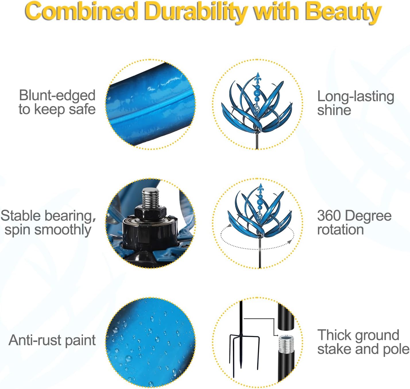 • 【Withstand All Weather】Stable pronged base stake design to keep the outdoor large wind spinner balanced and firmly placed. Hand-painted and UV treated to resist fading, so it is long-lasting and will perfom well as a garden decoration.