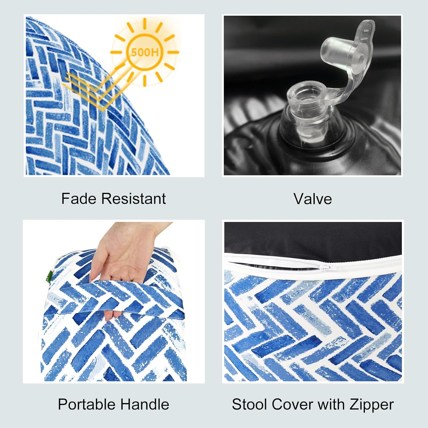 • SAFETY COMES FIRST: 250 micrometer PVC liner ensures lasting durability against tears and punctures; outdoor ottoman is light weighted enough for children to carry, but can also bear up to 220 pounds (100kg). It brings you comfort and sense of safety even if an adult sit on it.