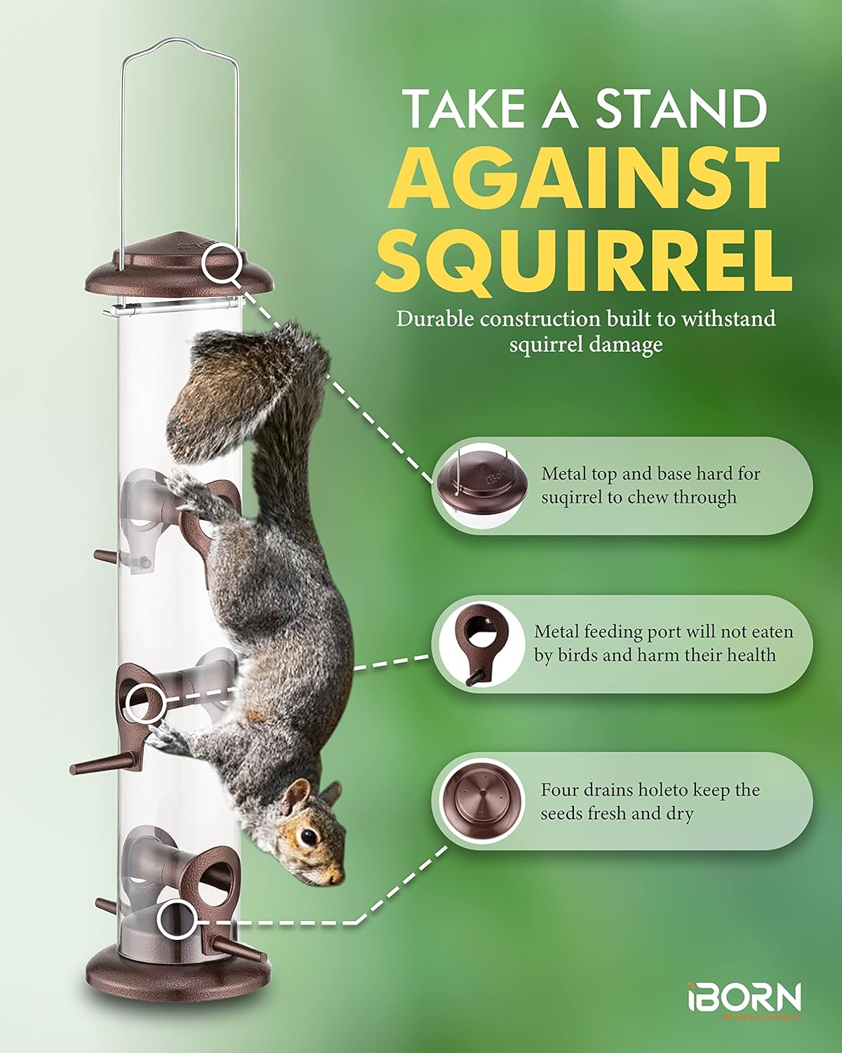 • 【Metal Bird Feeder】Metal top & base, aluminium feeding ports survived from Squirrel Damaging. Durable quality to sustain wear and worn outdoors. We adopt advanced technique for metal finishing to help the metal last longer when used outdoors.
