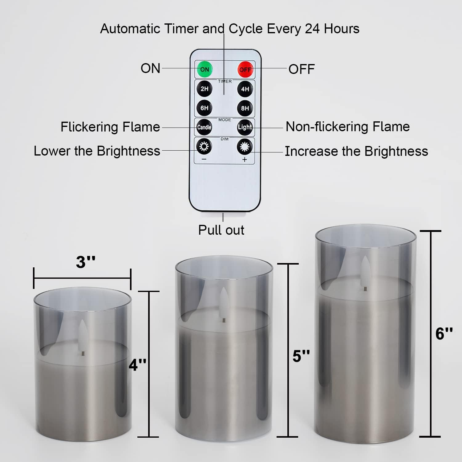 • Package Includes: This glass candle set includes three flameless pillar candles(D3”x H4”5”6”), a 10-key remote control, and one user manual. Each battery candle is powered by 2 x AA batteries (not included) which can live up to 500+ hours.