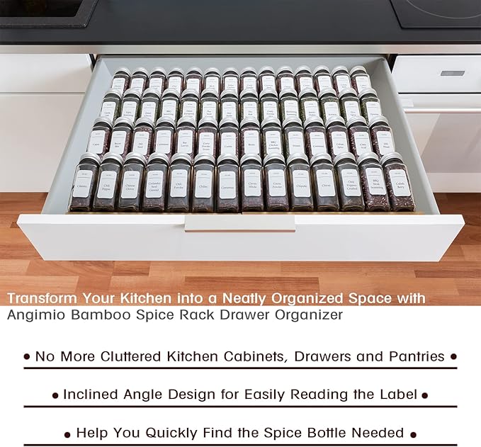 • NIFTY BAMBOO SPICE RACK ORGANIZER – A cluster of jars on your kitchen counter or drawer arranged haphazardly isn’t a sight that anybody would like to deal with! Keep your spices handy and neatly arranged with Angimio Bamboo Spice Rack Drawer Organizer.