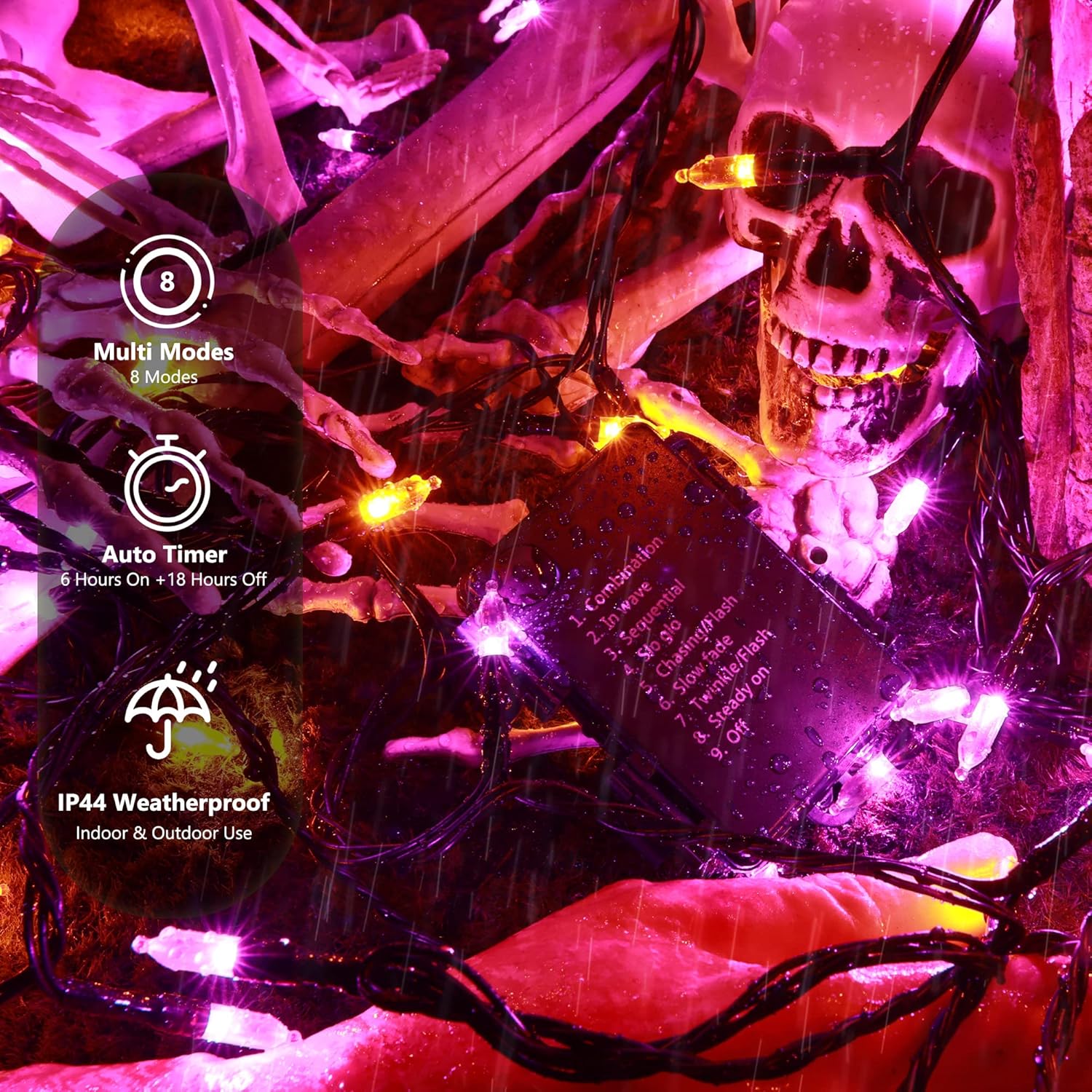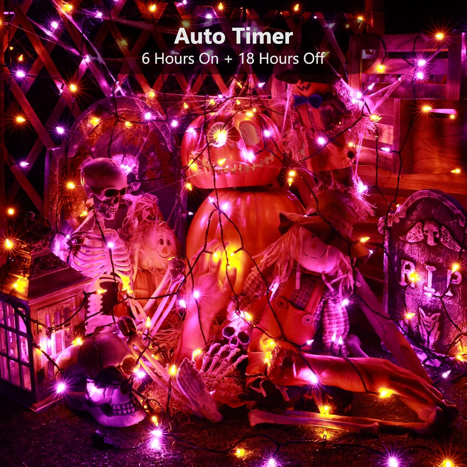 • 8 Modes & Auto Timer: These purple+orange halloween string lights have 8 gorgeous lighting modes with built-in auto-timer 6 hours "ON" and 18 hours "OFF", which starts once you activate any one of the 8 modes on the battery holder, so it will automatically time when the light is on. Note: If you change modes before the timer expires then it will stay on that mode for another 6 hours.