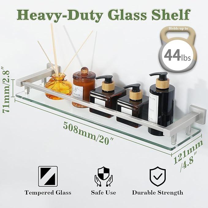 • TEMPERED GLASS:Our glass shelves are made with ultra-strong 8mm tempered glass and SUS304 stainless steel, ensuring a weight capacity that far exceeds standard shelves for reliable support