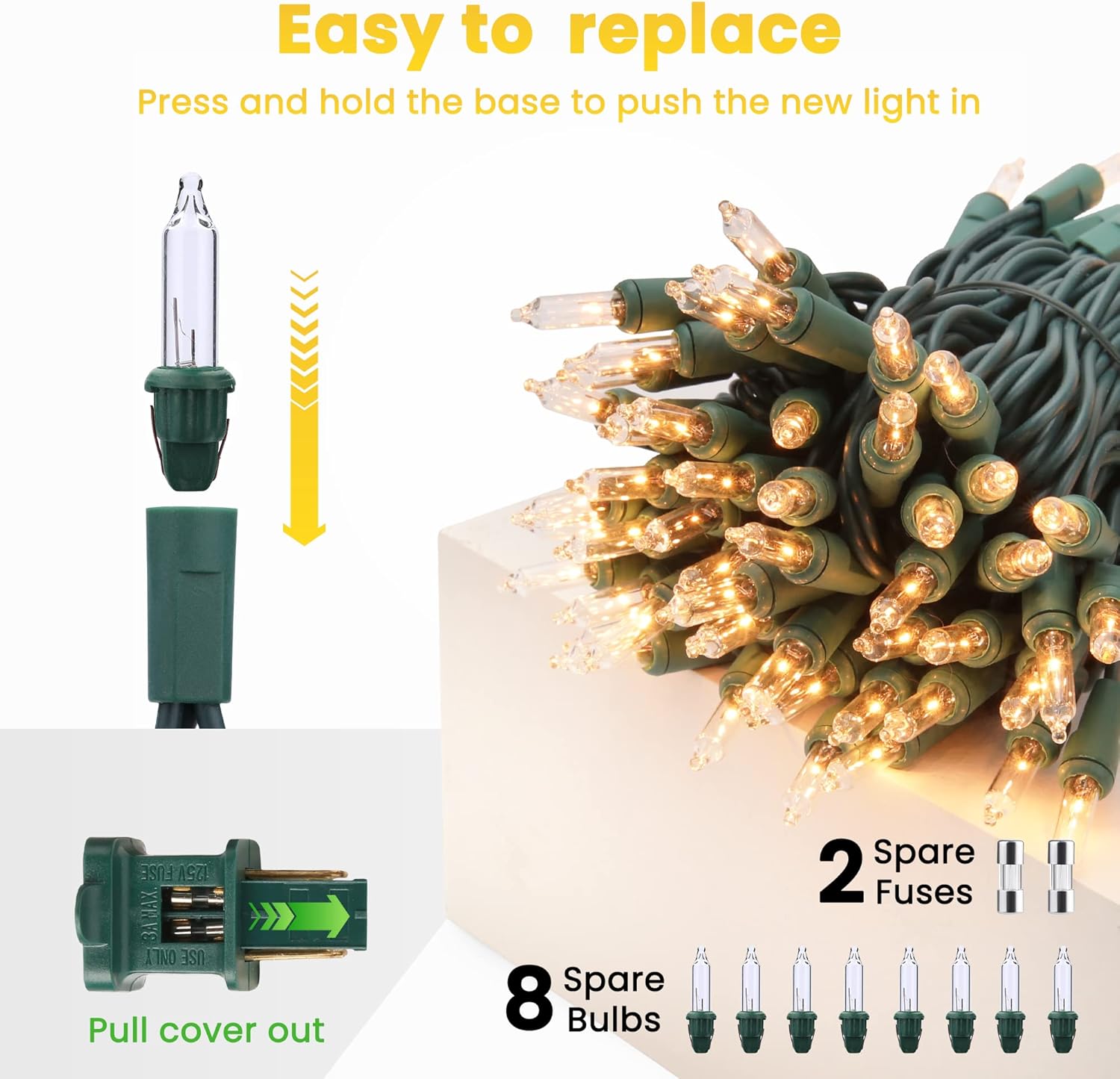 • 🎄 Specification & Quality Customer Service: 300 count mini bulbs, 75ft long green wire, the length between 2 bulbs: 3inch. Come with 8 spare bulbs and 2 spare fuses. Toodour provides 30-day money-back and 12-month replacements. If you have any questions, please feel free to contact us.