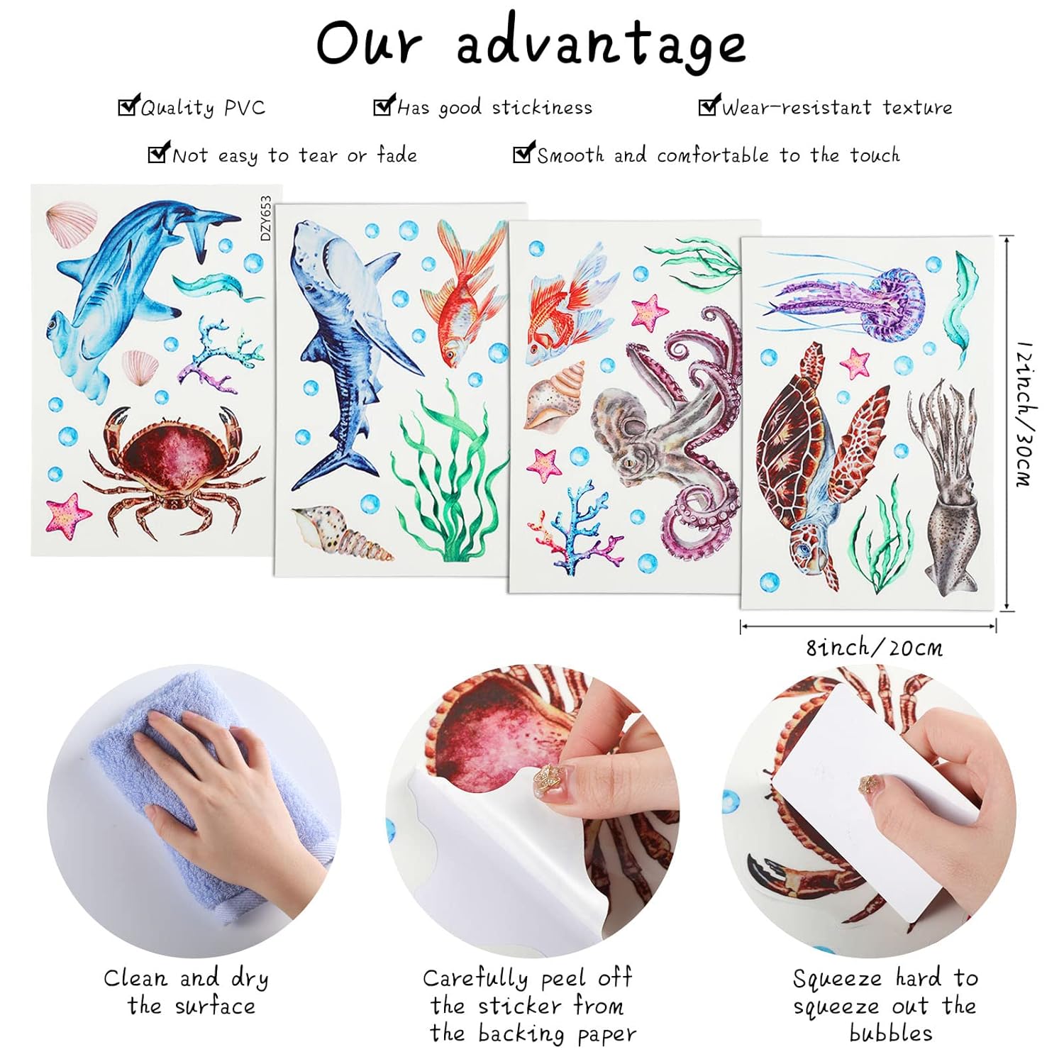 • Ample to Meet Your Needs: you will receive 4 sheets of ocean wall decals in different styles; The quantity and styles are sufficient for you to use and replace, and can easily meet your daily use and other requirements