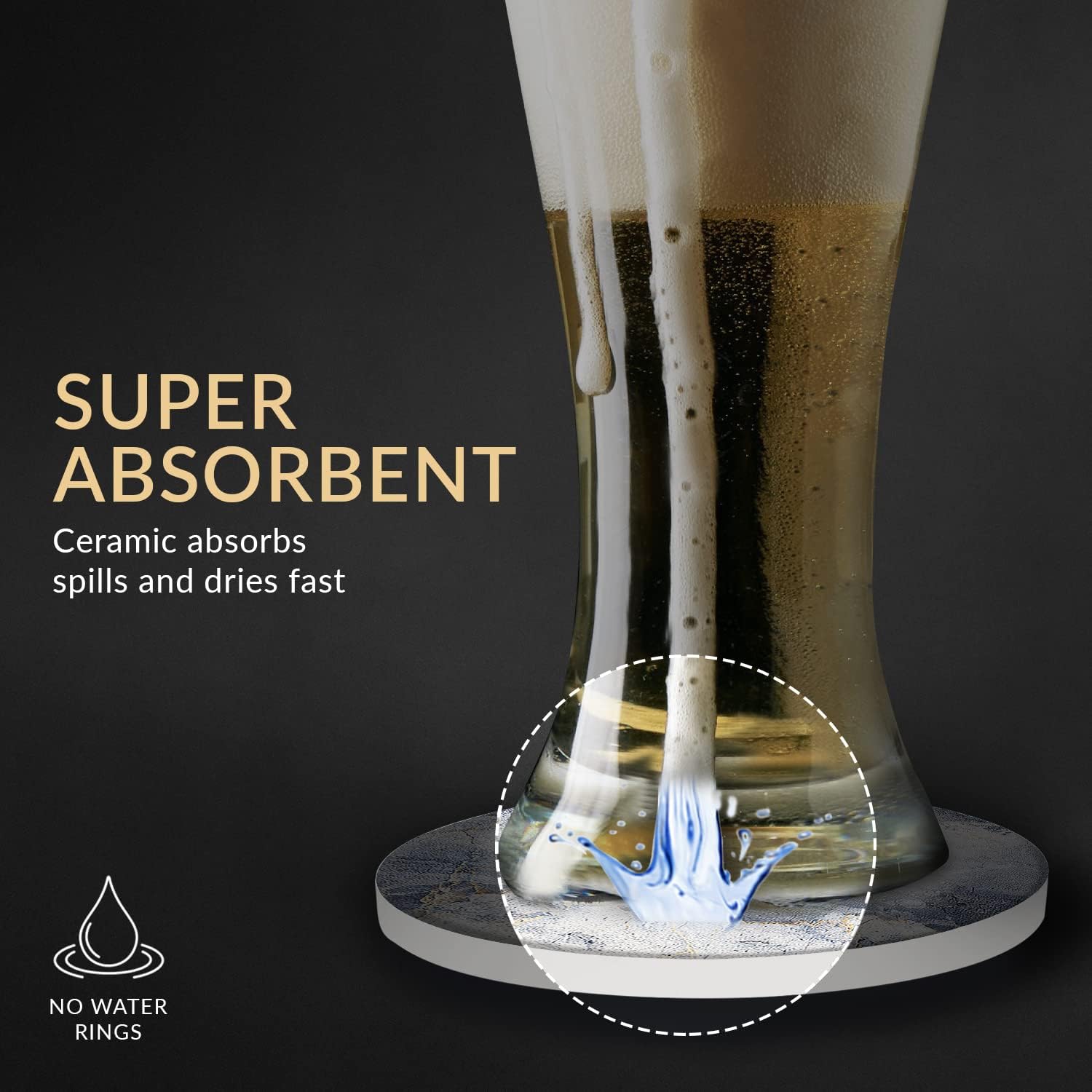 • ✅ LARGE SIZE – Our special material ceramic makes the coasters great for drinking beverage glasses, cups and mugs. Giftable idea for family, friends, women and men. Our wide selection includes black, grey, white, gold, brown, funny, mid century pattern, geometric, geode, rustic, minimalist and industrial style. Protects surfaces and absorbs faster than sandstone, soapstone, tile, cork, silicone, quartz, porcelain or marble.