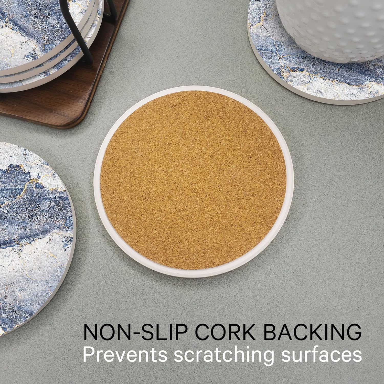 Emerson Essentials Coasters for Drinks Absorbent with Holder, Set of 6, Cork Bottom Ceramic Stone Marble Style for Wooden Coffee Bar Tables, Glass Tabletop Non Slip, Natural Stone
