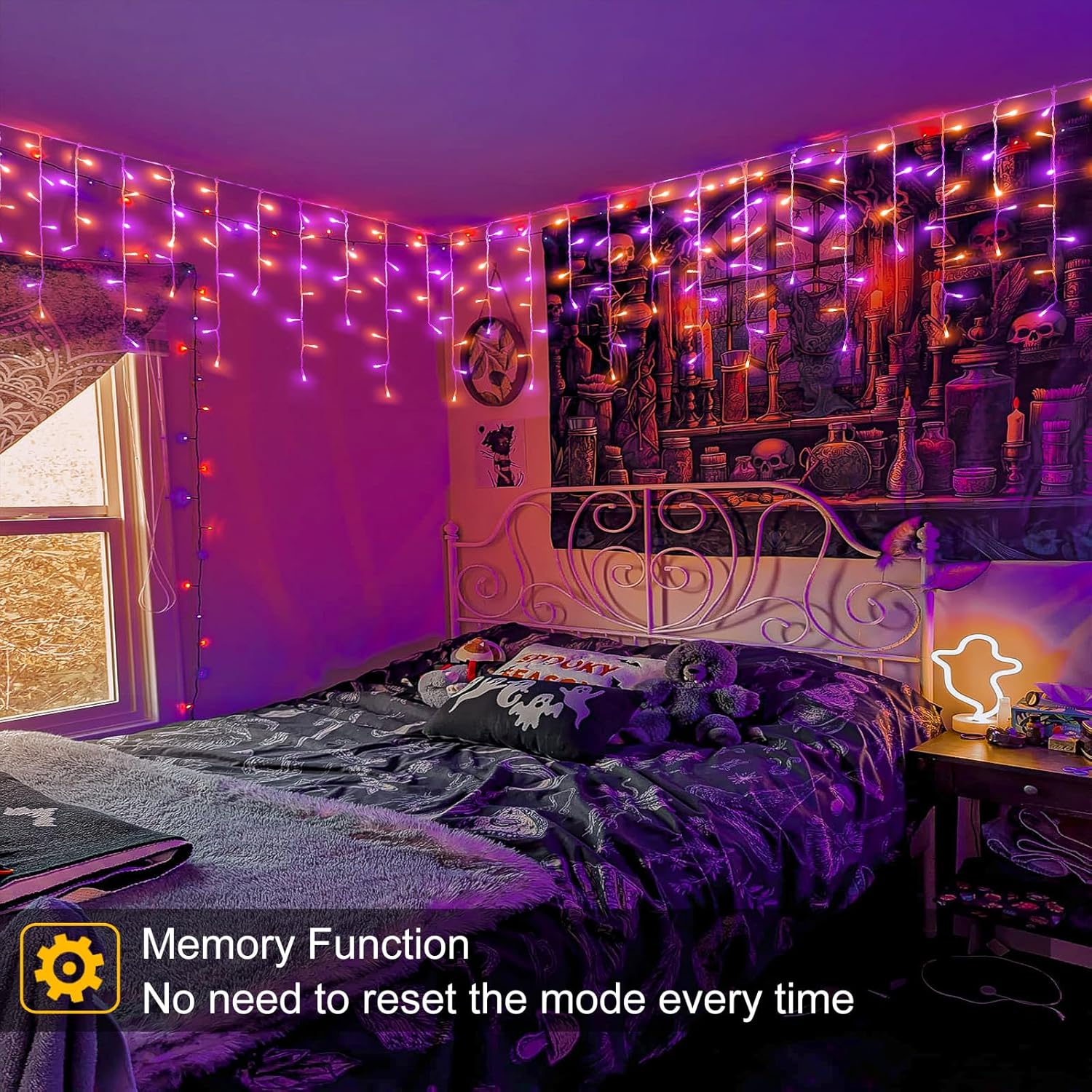 • Connectable Icicle Lights for Outside: 400 pieces LED bulbs 32.8ft light length, each Christmas lights has end-to-end connection that allows up to 3 light strings connected together to meet your different decor needs. 9.84ft lead wire meant no need an extension cord, perfect orange and purple halloween lights for outdoor decoration.
