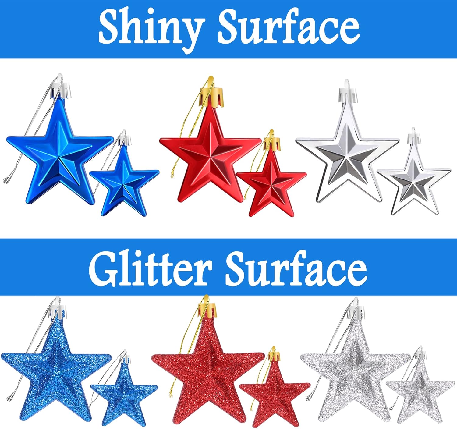 • Multiple Styles And Sizes: These star-shaped baubles have 2 styles and 2 sizes; 12 baubles in 4.8 cm/1.88 inches, 6 of which have shiny surfaces, and 6 of which have glitter surfaces; 12 baubles in 7 cm/2.75 inches, 6 of which have shiny surfaces, and 6 of which have glitter surfaces; Rich styles and sizes are enough for you to choose according to your own preferences and decoration needs.
