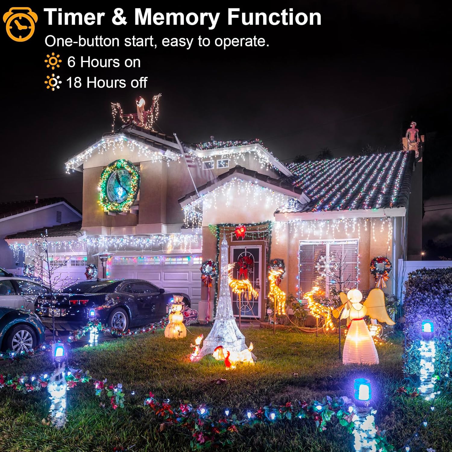 • [Timer&Memory Function] Long press the button on the plug 3 seconds until the green lights on, the LED icicle Christmas lights will be 6 hour on and 18 hour off automatically every day. Memory function design make the icicle lights will recover from the previous mode setting when you restart next time.
