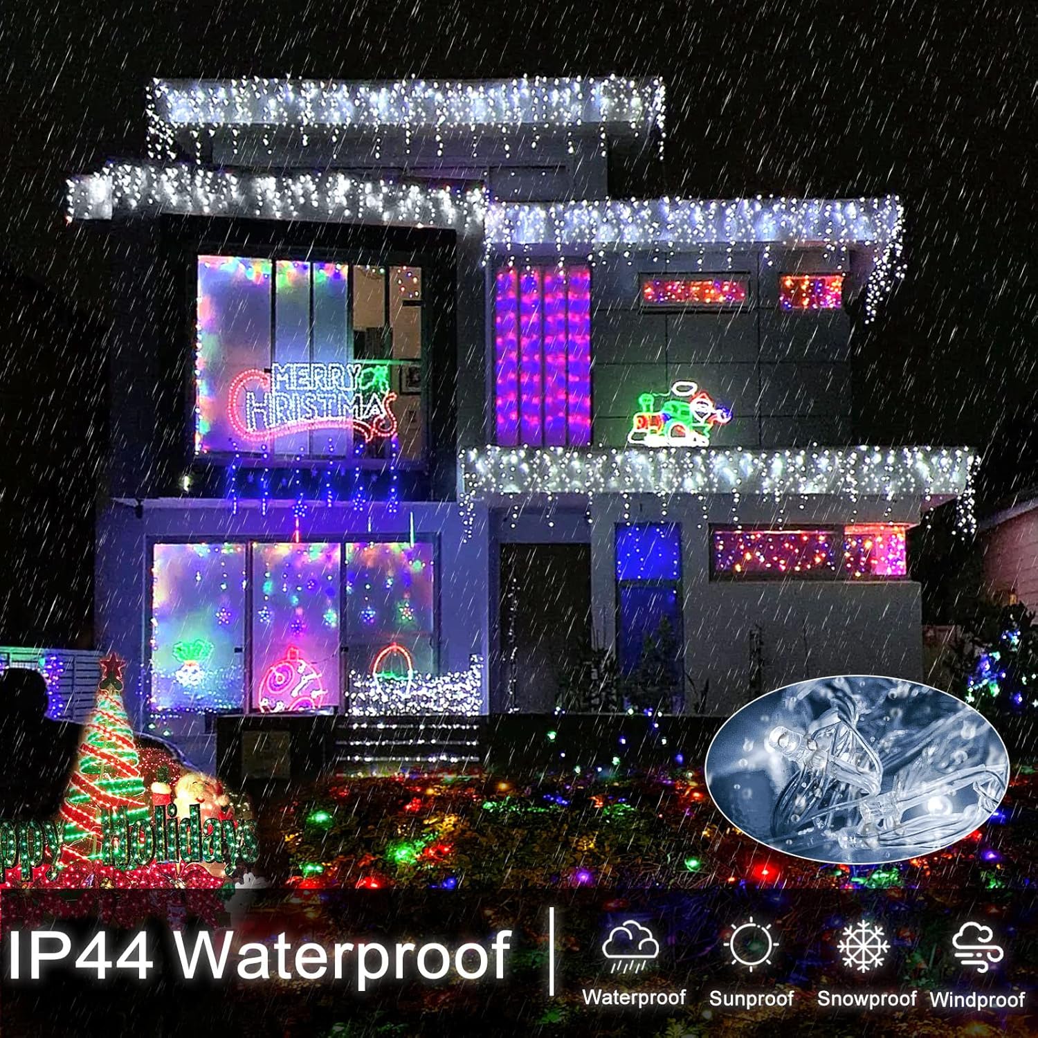 • [Waterproof&UL certified] The icicle lights are IP44 waterproof, which is perfect for outside decoration and can work normally even in wind, rain, freezing rain, heavy snow and freezing cold temperatures. These Christmas lights has approved UL Certification, output voltage is 29V, it's completely safe to touch. These led icicle lights are made of 100% premium copper wire and will not overheat even after prolonged use.