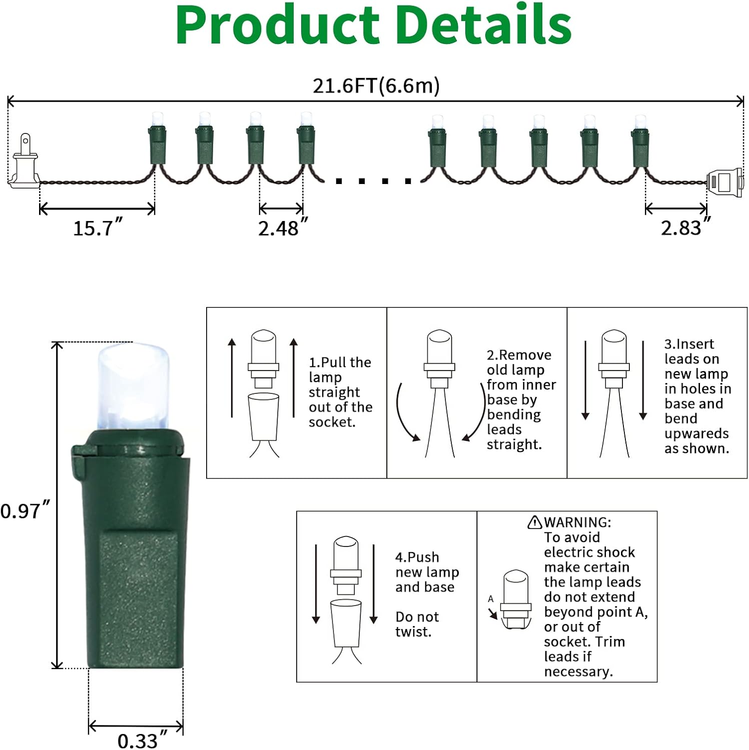 • 5mm LED Christmas Lights: 100 counts warm white 5mm wide angle stable LED string lights spaced 6.3 inches apart with green wire. 7.1 inch leads have a stackable male plug and 5.9 inch tails have a female plug for easy end to end connection.