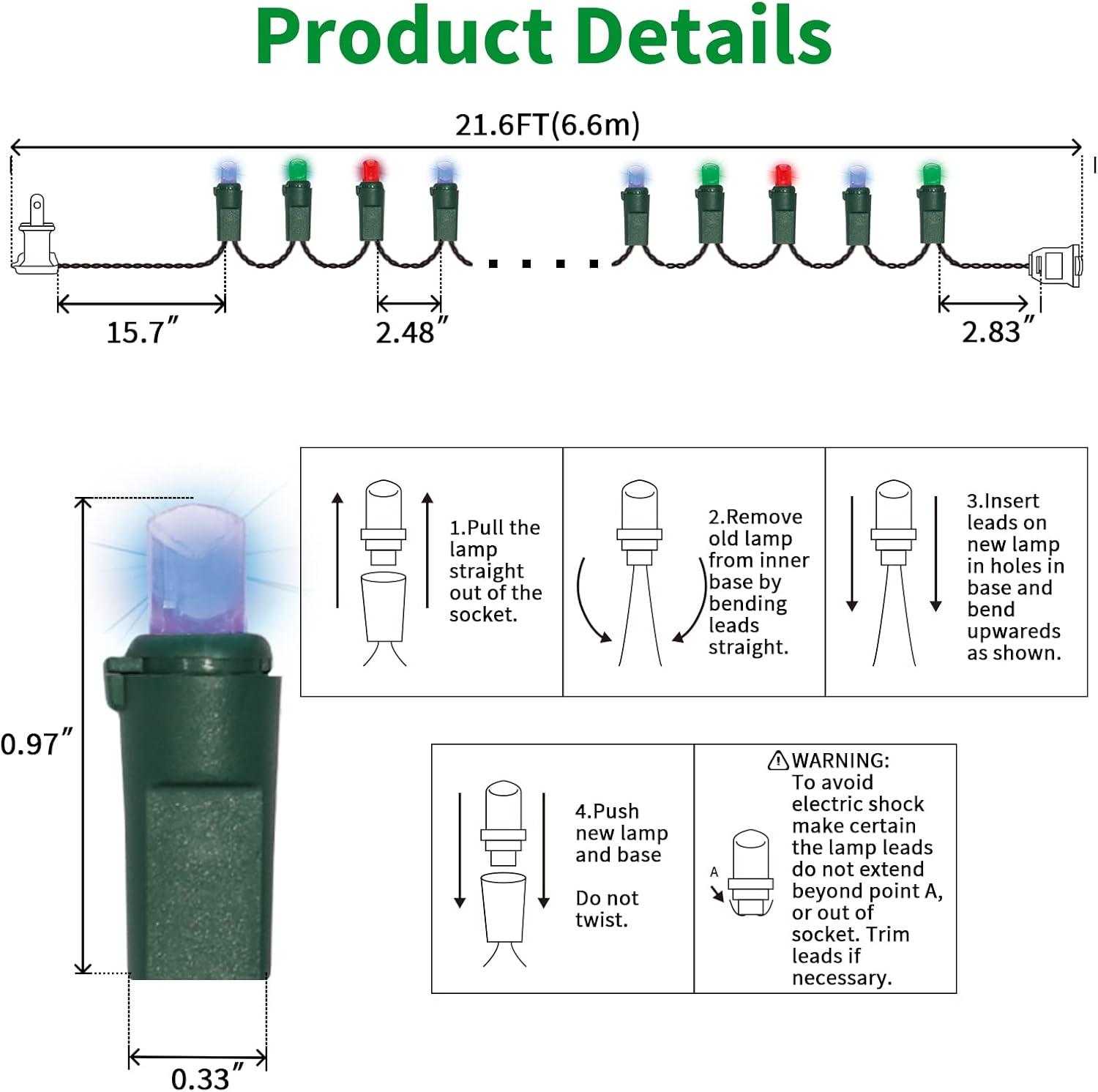 • 5mm LED Christmas Lights: 100 counts warm white 5mm wide angle stable LED string lights spaced 6.3 inches apart with green wire. 7.1 inch leads have a stackable male plug and 5.9 inch tails have a female plug for easy end to end connection.