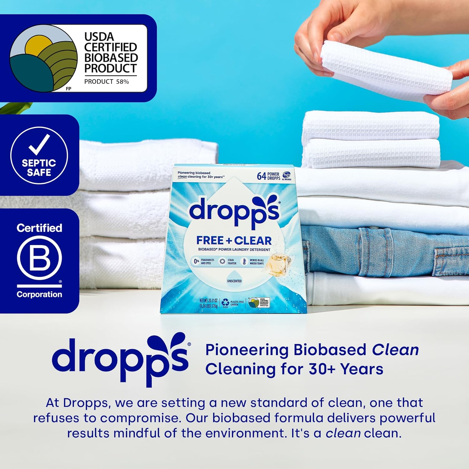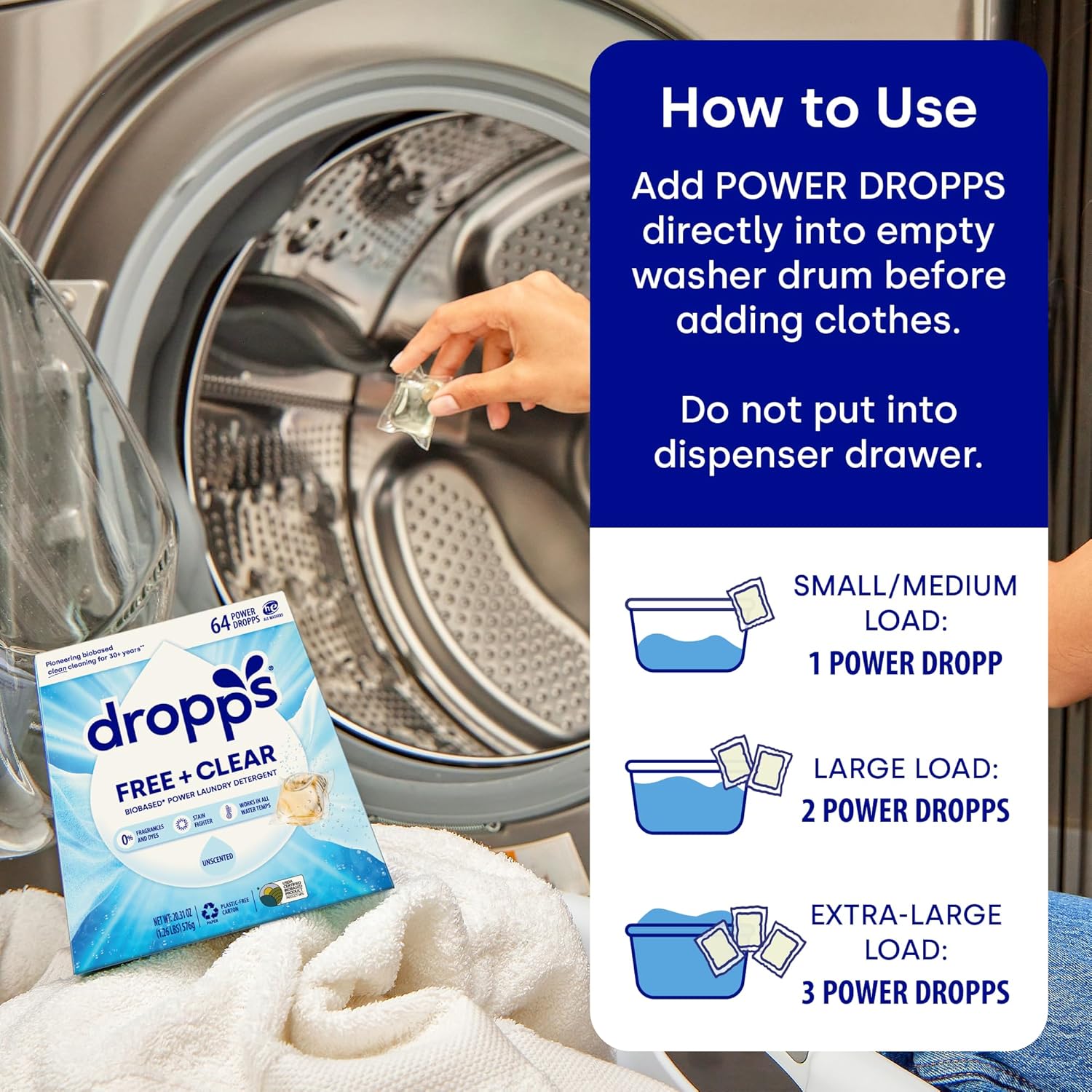 • EFFORTLESS CLEANING POWER: Get your laundry exceptionally clean with Dropps Free + Clear Laundry Detergent Pods. These Power Dropps are specially formulated to lift away stubborn stains and neutralize odors effectively, providing a thorough clean with each wash. Compatible with all washers (HE + standard), wash cycles, and temperatures. Unscented. 64 Power Dropps.