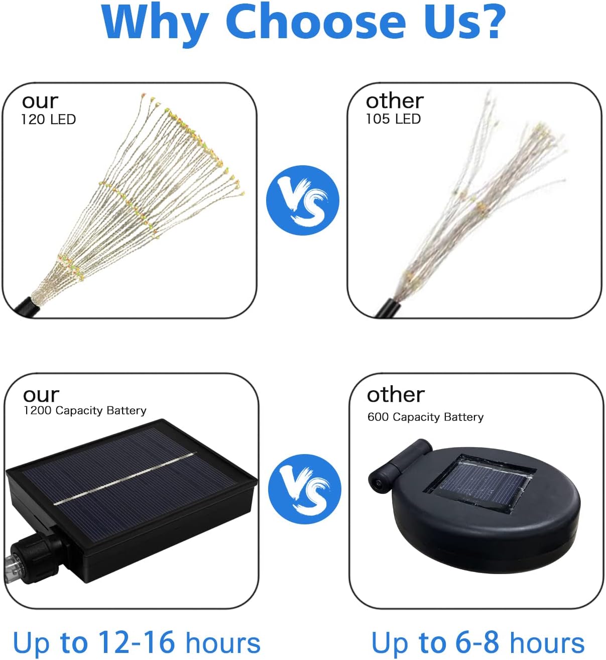 • [Continuous Lighting For 12~16h] While most brands use 600 capacity battery, Unihoh solar garden fireworks lights are equipped with 1200 ultra-large capacity rechargeable battery, which is able to provide 12-16 hours of continuous lighting after 4-6 hours of full charge while others can only work 6-8 hours.