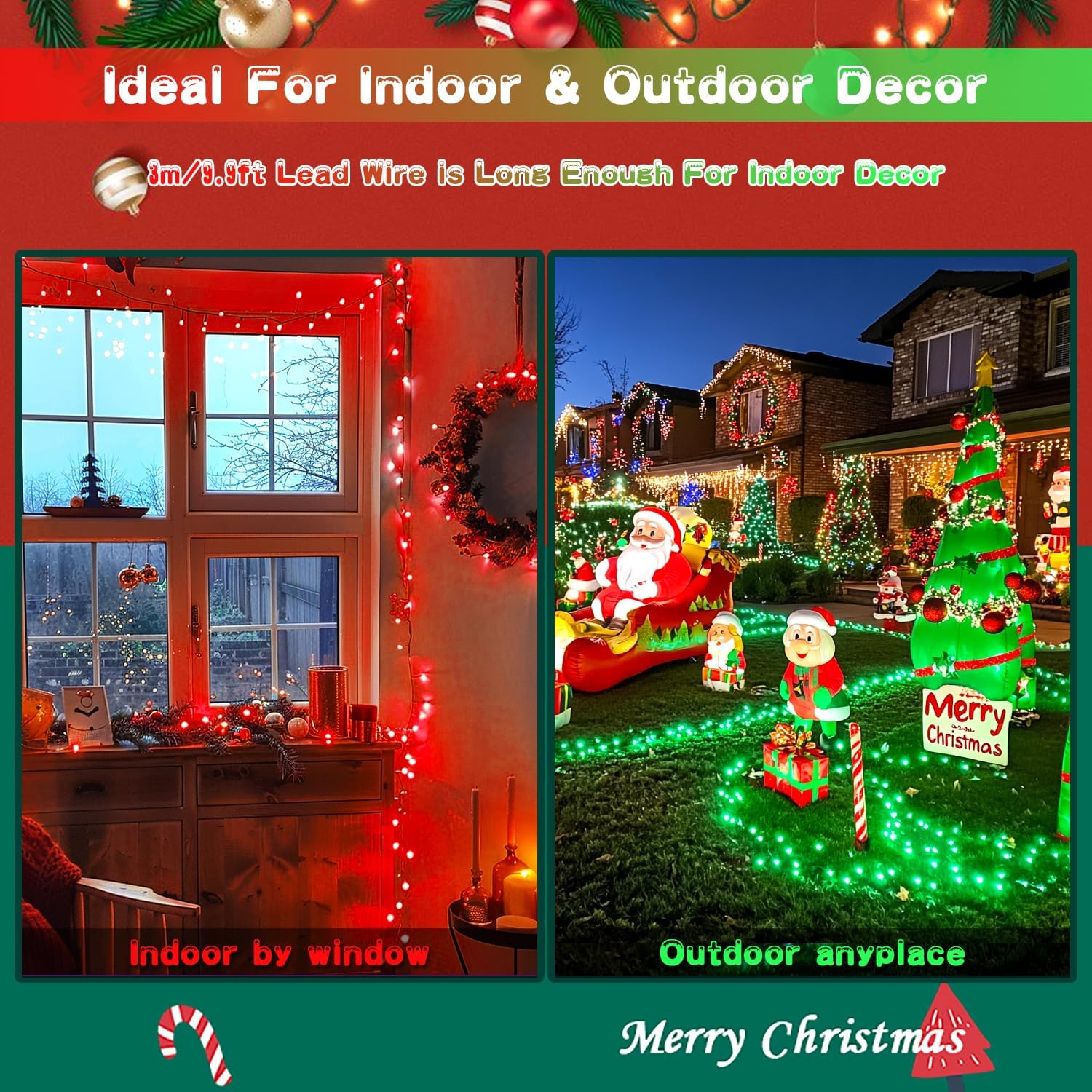 • Widely Used Solar String Lights: Nothing can compete with lightings when it comes to atomosphere building! You definately need our red and green string lights to decorate every part of your home for Christmas! The solar string lights is long enough to apply on diverse outdoor scenes such as yard, patios, porches, gardens. More surprisingly! The leading wire is 3m/9.9ft long, so you can put the solar panel near window to absorb the sunlight. Indoor decoration is also great