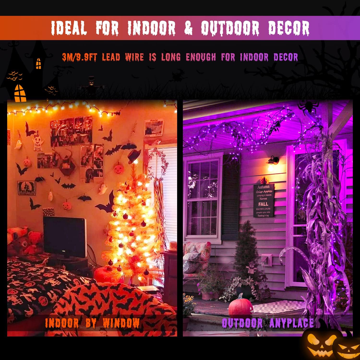 • Widely Used Solar Halloween Lights: Nothing can compete with lightings when it comes to atomosphere building! You definately need our orange and purple Halloween lights to decorate every part of your home for Halloween! The solar string lights is long enough to apply on diverse outdoor scenes such as yard, patios, porches, gardens. More surprisingly! The leading wire is 3m/9.9ft long, so you can put the solar panel near window to absorb the sunlight. Indoor decoration is also great
